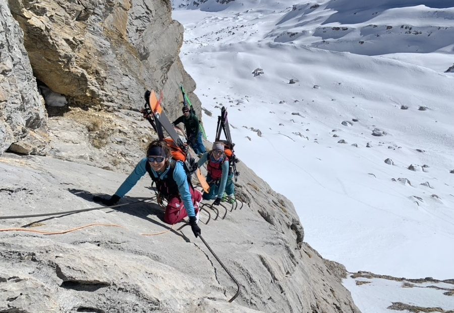 Après une belle descente glacière, une randonnée à ski entrecoupée d’une via ferrata nous donnera accès au Gstellihore.